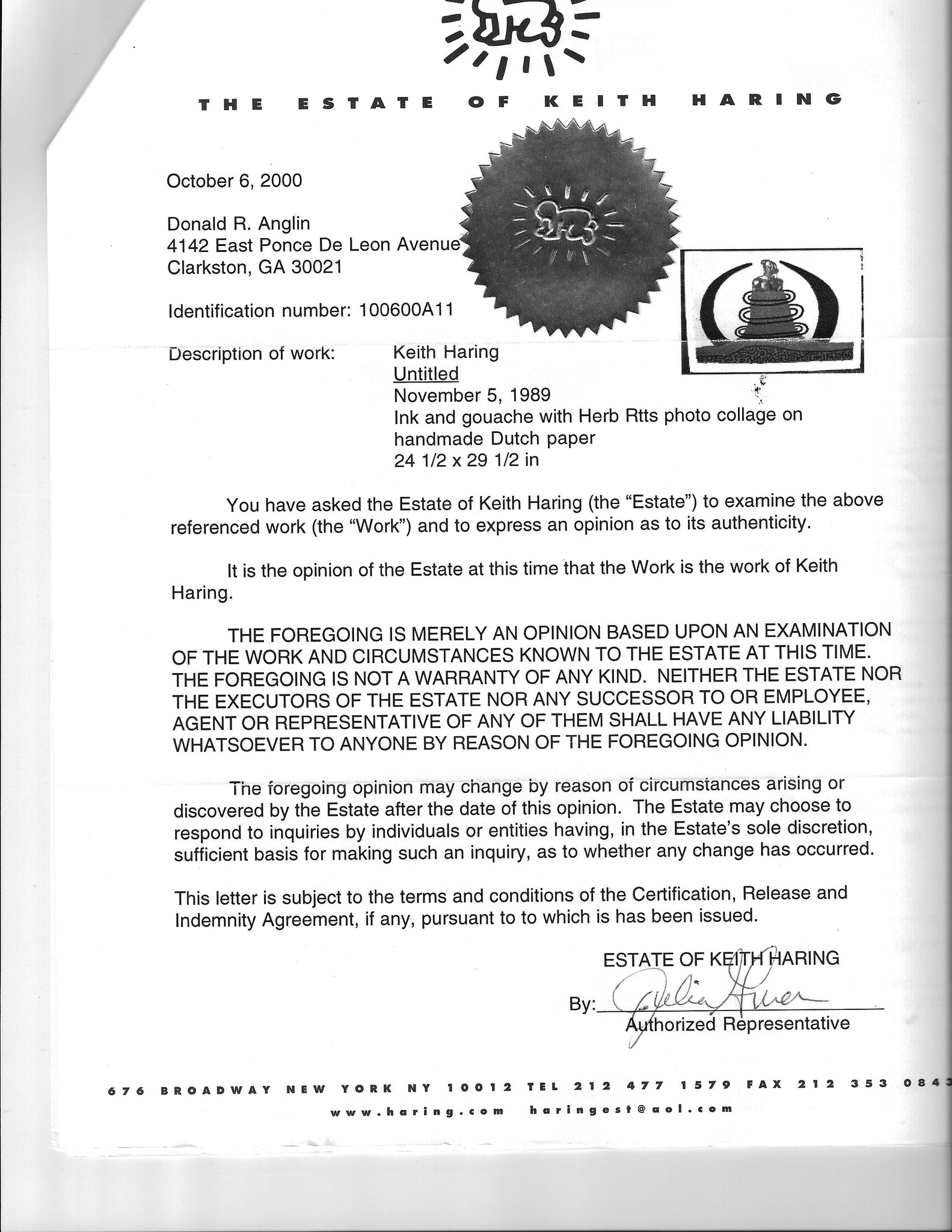 Keith did an extremely limited series of original artworks in unofficial collaboration with Herb Ritts, using cutouts out Ritts photography in collage styles. This painting available represents Keith Haring's inspiration and awe of Tribal African society, with the Tribal leader at the top of the heirarchy, being protected by giant Elephant Tusks and watching over his tribe which is represented by the characters in red at the bottom of the painting.
